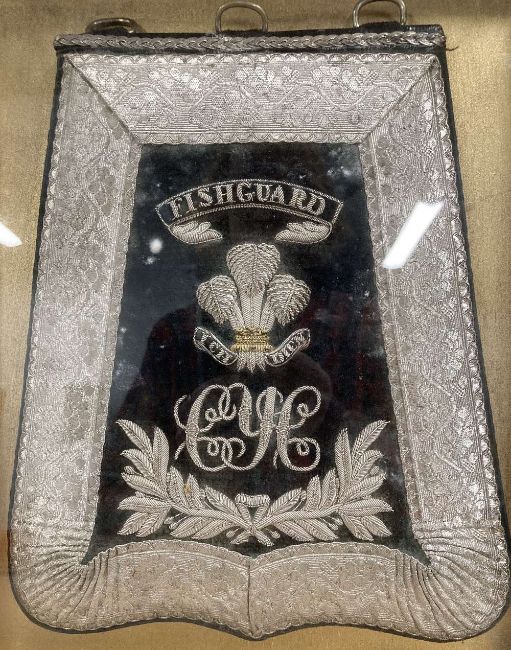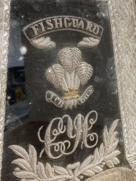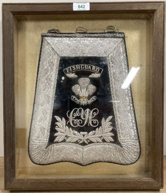 Pembroke Yeomanry (Cavalry) Full Dress Officer's Sabretache, 29cm x 34cm, black cloth or felt edged with thick ornately decorated silver braid, FISHGUARD embroidered silver in black scroll above Prince of Wales feathers with motto ICH DIEN above emroidered silver wire interlaced C Y C cipher for Castlemartin Yeomanry Cavalry, with embroidered silver bullion ornate floral decoration below, pouch of black leather with three white metal D ring fittings to the top. Appears to be in very good all-round condition for age, in fitted wooden frame, glazed for display, overall 4cm x 36cm x 42cm.(1) This unit, formed in 1794 is famous for the part that it played at the Defence of Fishguard in 1797, during the French Revolutionary Wars and is the ONLY unit of the British Army to bear the UNIQUE Battle Honour 'FISHGUARD' for the action which took place on home soil. A very nice Victorian period display piece and somewhat rare collectable. Thought to have been connected to the Fothergill family and possibly once the property of Lieutenant Colonel Sydney Roden Fothergill (1864 - 1943), who served as a Major in the Pembroke Yeomanry between 1901 and 1904, including during the Boer War as a Captain in the 34th Imperial Yeomanry in 1902 and who commanded the Westmorland and Cumberland Yeomanry Cavalry between 1911 and 1916.