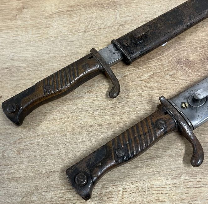 WWI German Mauser Butcher Sword Bayonet Model 1898/1905, 36.5cm steel single-edged fullered blade, spine stamped with Crown above W 15 and other marks, the ricasso with makers mark SIMSON&CO SUHL, hooked steel pommel with working release button, ribbed wooden grips and rear-facing quillon stamped with Crown to underside, white-metal scabbard tarnished with some rusting throughout, 52cm overall. Sold together with another, similar, this having clean 36.5cm blade, spine having illegible marks, the underside of the quillon stamped with Crown above h and numbered 340, the side with number 261, markers mark to ricasso for FICHTEL&SACHS SCHWEINFURT, rusted black-painted metal scabbard stamped WAFFENFABRI MAUSER A.G. OBERNDORF a.A. 52cm overall.(2) Buyer must be aged 18 or over and show proof of identity, thank you.