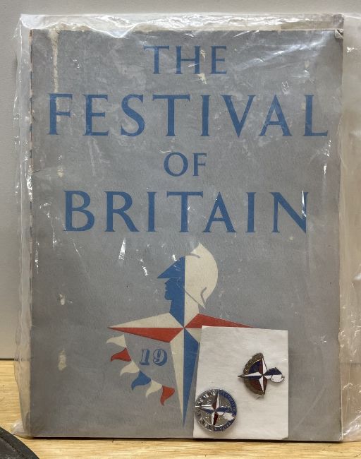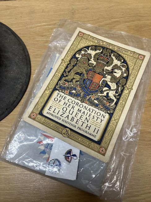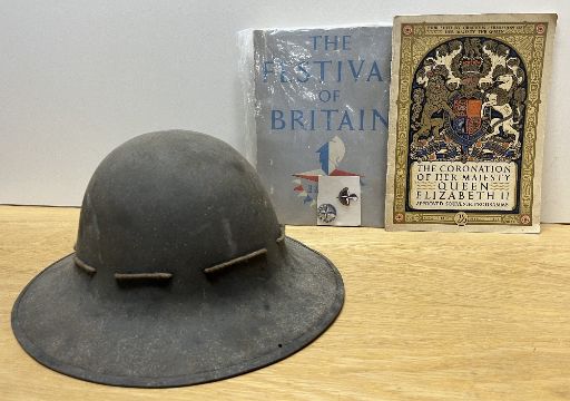 WW2-period British Home Front Zuckerman-style Civilian Protective Helmet, khaki brown, string chin strap, canvas webbing, leather liner ink stamped 7 JRS 1941. Sold together with an Order of Proceedings dated 26 July 1949 for the visit of Princess Elizabeth and the Duke of Edinburgh to the County of Halifax, an Official Book for The Festival of Britain 1951, two 1951 Festival of Britain commemorative pin badges, an eight page leaflet for the Civic Service in the Parish Church of Halifax and in Square Congregational Church on the occasion of the Coronation of Her Gracious Majesty Queen Elizabeth the Second 31 May 1953 and an Approved Souvenir Programme for The Coronation of Her Majesty Queen Elizabeth 2 June 1953.(7)