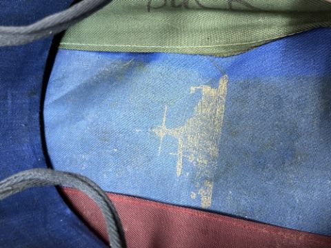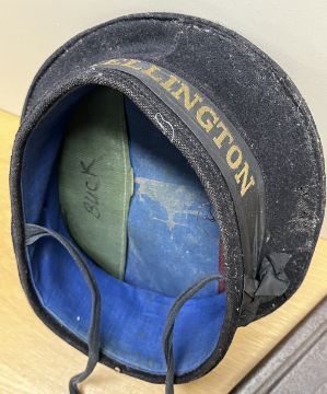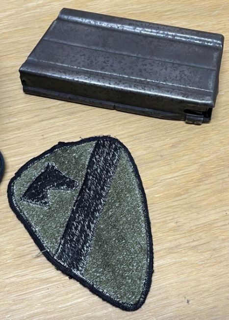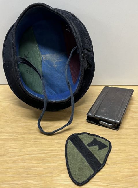 Royal Navy WW2-period black cap with H.M.S. KELLINGTON gold lettering on black silk tally, the cap in poor condition with holes and tears, particularly to top, no size. Sold together with a steel magazine for an FN FAL rifle, stamped with an M in a U to spine, 8cm x 15cm and an original Vietnam-period subdued black on olive green US Army 1st Cavalry Division embroidered arm patch/badge.(3)