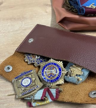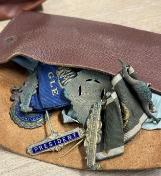 Royal Order of Antediluvian Buffaloes maroon and light blue sash, embroidered in gold thread 'RAOB GLE St. Albans & District P.G.P. 1954' with gold thread tassels, sold together with nine jewels or medals, mostly engraved to Bro. William R.J. Griffiths and dated between 1946 and 1964, five being Birmingham hallmarked silver pieces, a Birmingham silver hallmarked St. John Ambulance Association medal engraved to 376302 Mary M.Hutton with two clasps for 1934 and 1935, four AAA Southern Championship bronze-coloured medals dated 1932 and 1934 for javelin and long jump and a Collins of London Girl Guides pin badge.(16)
