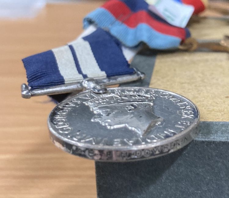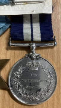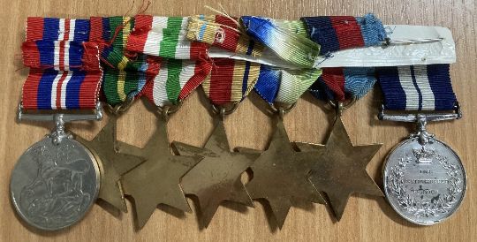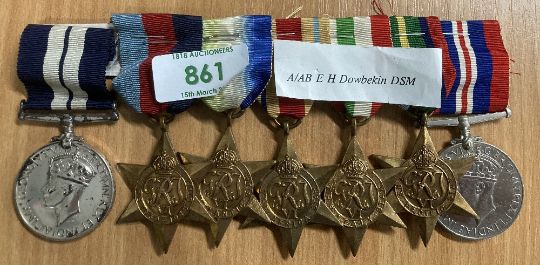 WW2 Royal Navy Distinguished Service Medal group of seven, comprising GVI DSM engraved naming A/AB E H DOWBEKIN C/JX 266533 (this being a silver-plated copy, the silver-plating wearing off in places), 1939-45, Atlantic, Africa, Italy, Pacific stars, War medal all stapled to a piece of card, the DSM having a metal pin bar. Online sources confirm the award of the Distinguished Service Medal to Ernest Howard Dowbekin from Egerton, Bolton for DEMS in the Birthday Honours List of 1945, as published in the London Gazette of 14 June 1945.(7)