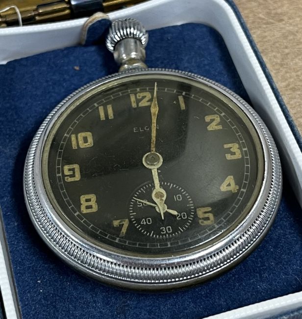 WW2-period ELGIN Military pocket watch, black face with separate seconds dial, plexiglass cover, white metal Dennison-style case, broad arrow military logo and TK 11238 stamped to rear. The action is controlled by a winding knob which functions and the watch appears to be in working order, but would benefit from a service. The Elgin National Watch Company of America was a long-standing manufacturer of Military-grade watches, particularly during the Second World War. Sold together with an unnamed WW2 War medal with ribbon in its unnamed box of issue.(2)