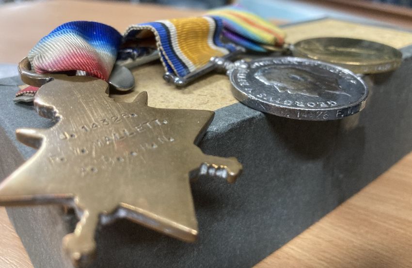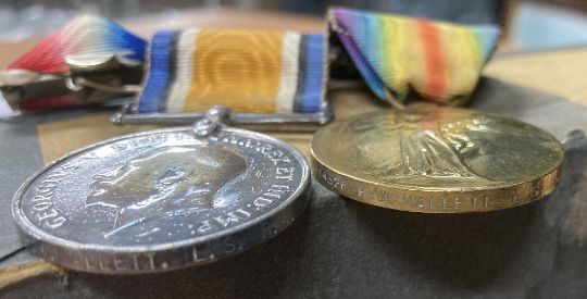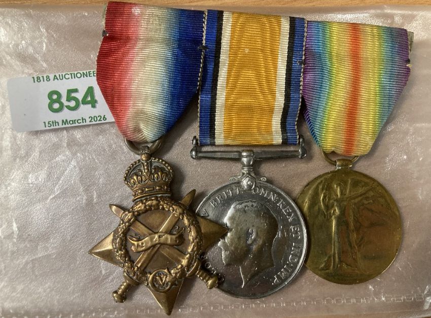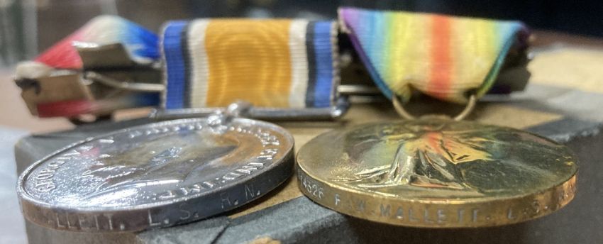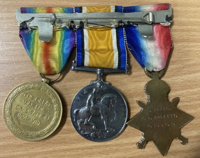 WW1 Royal Navy trio comprising 1914-15 star correctly impressed naming to J.14326. F.W. MALLETT. A.B. R.N. British War and Victory medals correctly impressed naming to recipient as L.S. R.N. mounted on pin bar for wearing, the BWM with contact marks around the number, the VM with verdigris around number. Online sources confirm the award of the 1914-15 trio to Frederick W. Mallett whilst serving aboard Diligence, a destroyer depot ship. Frederick William - incorrectly transcribed as Wilham - Mallett was born 28 December 1894 at Woodbridge, Suffolk and was a cycle repairer when enlisting into the Royal Navy for twelve years in 1912. He was serving aboard HMS Formidable, a pre-dreadnought battleship when war broke out. In the first days of the war, the 5th Battle Squadron covered the crossing of the British Expeditionary Force to France and the transportation of the Portsmouth Marine Battalion to Ostend. On 31 December 1914, the squadron was conducting training exercises in the English Channel, and despite the risk of German submarines, was without anti-submarine protection; the German U-24 stalked the ships during the day and in the early hours of 1 January 1915, torpedoed Formidable twice, sinking her with heavy loss of life, 35 Officers and 512 men being killed in the sinking - Mallett survived and was next aboard HMS Calliope assigned to the Grand Fleet for service as flagship of the 4th Light Cruiser Squadron. She was badly damaged by a fuel oil fire in her boiler room while at sea on 19 March 1916, but was repaired in time to be one of the five ships in the 4th Light Cruiser Squadron at the Battle of Jutland on 31 May-1 June 1916 when she received a number of hits. He was pensioned in 1934. It appears that he was recalled to the Navy for a month in late 1938 and again from 1939 to 1941, thought to be shore based.(3) Recipient's service records are available to download online and make interesting reading.