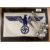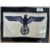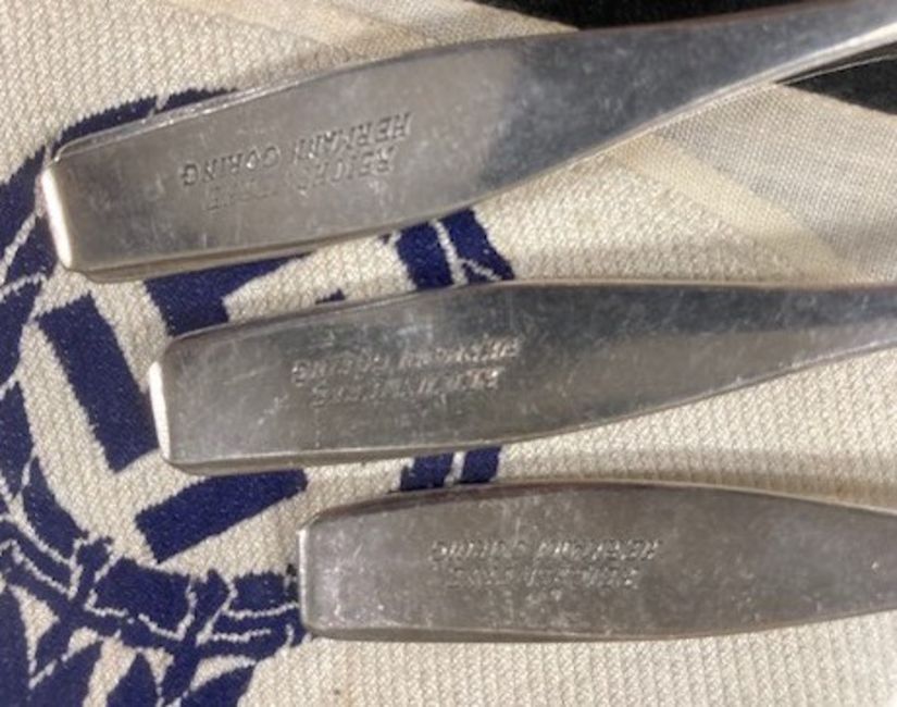 WW2-period Third Reich Kriegsmarine Sports Vest Eagle badge, blue on white background above a swastika within wreath, uncut woven, mounted, glazed and framed on black felt backing, 21cm x 30cm. Sold together with three silver-plated white metal German Wellner teaspoons, each stamped WELLNER Patent 90 in a circle and 18 in a square to reverse of finial and REICHSWERKE HERMANN GORING on the flat handle.(4)