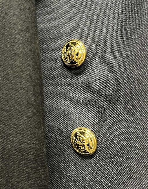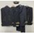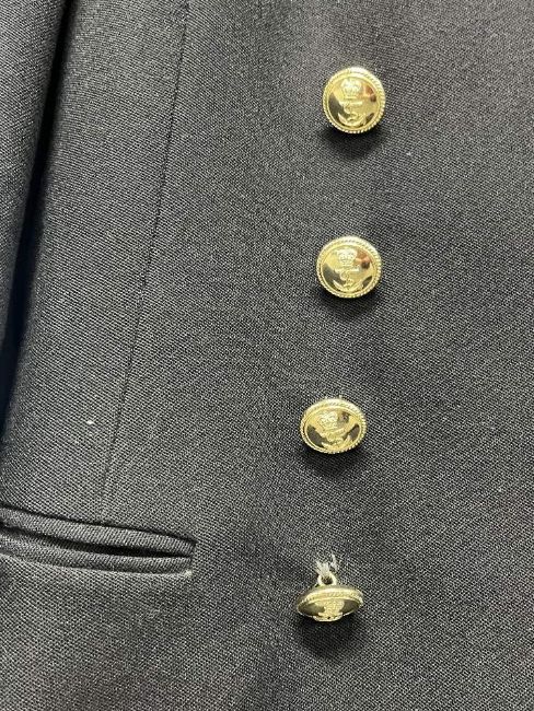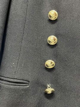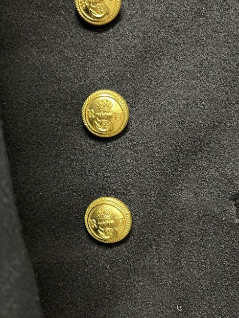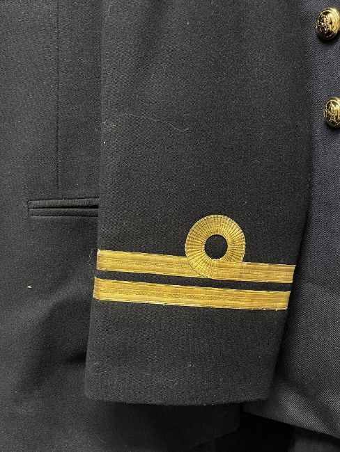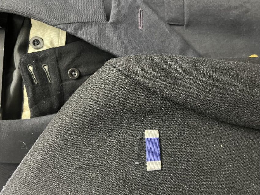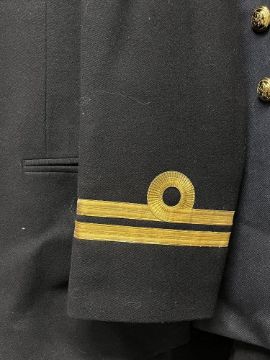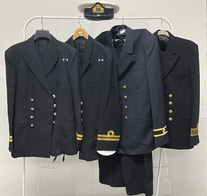 Naval Officers post-war uniforms comprising a Merchant Navy Officer's size 44L double breasted reefer/bridge jacket made for George Lock of Dover having MN buttons and Third Officer or Purser's gold lace rank insignia to cuffs, with matching high-waisted trousers, no size seen, a Royal Navy Volunteer Reserve double breasted reefer/bridge jacket, no size seen, with RNV King's Crown buttons and Lieutenant Commander's 'R' for Reserve gold lace rank insignia to cuffs, with matching trousers, no size seen, having tag for Baker & Co of Devonport and annotated in ink 'J.M.B. Dathan 463 7:59, a Royal Navy double breasted dress jacket with RN Queen's Crown buttons and Lieutenant's gold lace rank insignia to cuffs and ribbon for the Royal Navy Long Service and Good Conduct medal to breast, with matching trousers, no sizes seen and both having tag for Gieves & Hawkes of Saville Row, the trouser tag annotated in ink 'S/LT Forbes Edinburgh', another, similar RN matching jacket and trouser, no sizes seen, with labels for Ambassador and a RN Officers white top black peaked dress cap, leather inner-band, black leather chin strap, with embroidered bullion Queen's Crown over Anchor within a laurel wreath. All in good condition as worn, with all buttons present and no visible moth damage.(9)