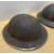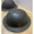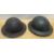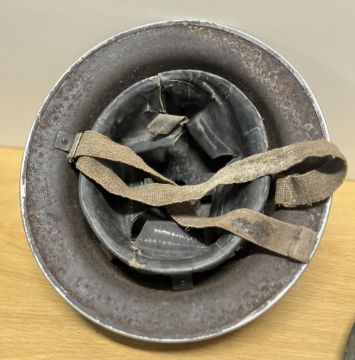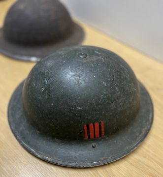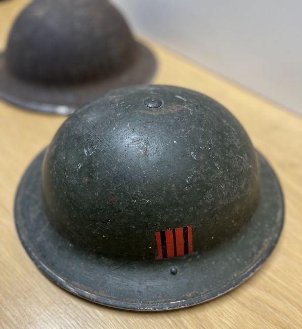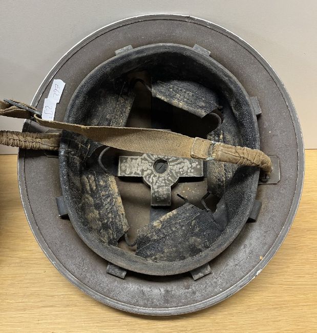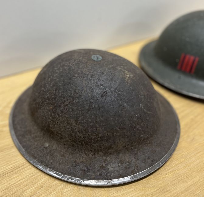WW2-period British MK II Brodie steel combat helmet, rivet to crown, rounded edge, having red and blue or black vertical striped unit designation or formation patch to one side, black painted leather interior, elasticated webbing chin strap, maintaining most of its exterior paint finish and in good condition for age. Sold together with another, similar but rusted example, this in generally poor condition.(2)