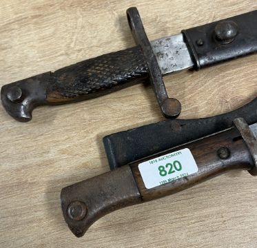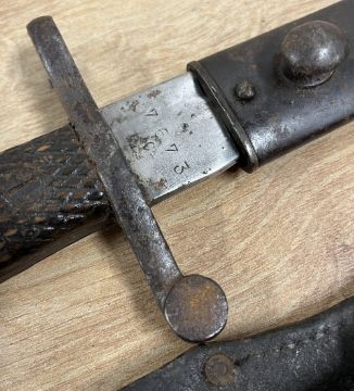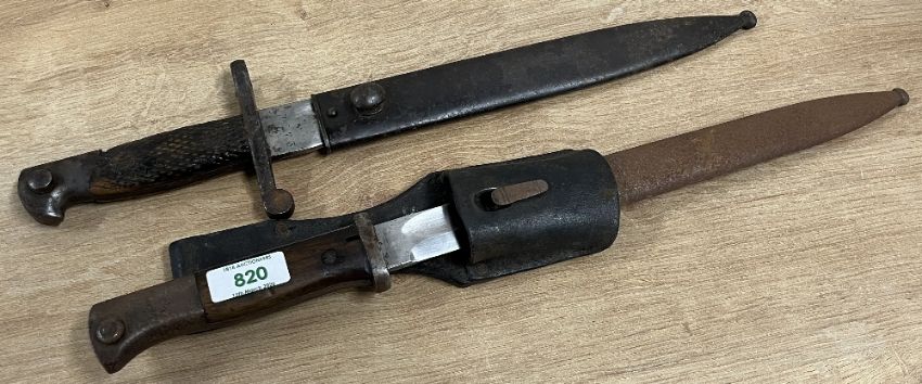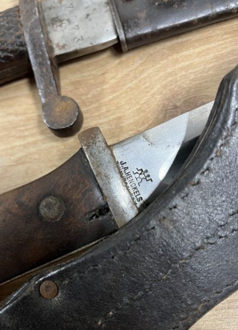 WW2 Spanish Bolo Mauser bayonet, clean single-edged and fullered 25cm blade stamped 7673 above C, wooden checkered grip, 'bird-beak' pommel and working release button, metal black-painted scabbard stamped 7673 above C, 39.5cm overall. Sold together with a German K98 bayonet, having a clean single-edged fullered 24.5cm blade, spine stamp part illegible but W 17, ricasso stamped with 'Egyptian-style' logo above makers mark for J.A.HENCKELS, wooden grip, 'bird-beak' rusted pommel, working release button, metal scabbard rusted with dents and leather frog with no marks seen, 41cm overall.(2) Buyer must be over 18, proof of identity required, thank you.