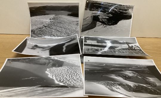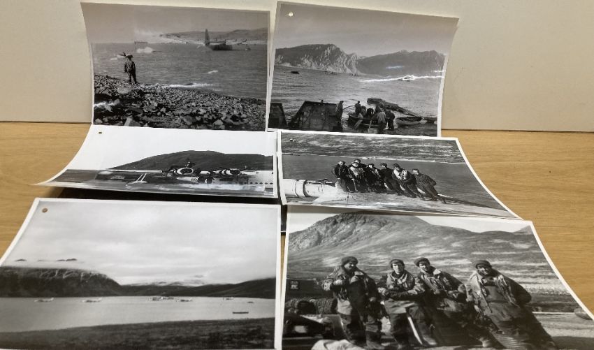 POLAR EXPLORATION relating to Royal Navy Commander James 'Jim' SIMPSON, who led the British North Greenland Expedition in July 1952 having already carried out a preparatory exploration in 1951, during which he found an ice-free glacial lake that would be a suitable place for landing and named it Britannia Lake (Britannia S?) after the future expedition. A collection of 63no. 16cm x 20.5cm Air Ministry photographs, many with annotated printed descriptions attached to rear and a pencil note of each numbered photo having similar descriptions. The 1952/54 British Scientific expedition sailed from Deptford aboard the former Norwegian sealer Tottan, while another cargo ship, loaded with four Weasel tracked vehicles, sailed from Hull. The expedition team consisted of 25 men; fifteen from the Armed Services and the Merchant Navy, nine civilian scientists and a Danish army officer. After collecting sledge dogs in South-West Greenland, the two ships sailed to Young Sound (Sund) on the North-East coast. From there RAF Sunderland flying-boats airlifted the expedition to Britannia Lake in Queen Louise Land and set up the main base camp of the expedition. Commander Simpson then led a party on dog sleds to establish the North Ice station about 230 miles (370 km) to the West. The Weasels were landed on the coast and drove the 100 miles inland as far as the base camp. Once the party arrived at the site of North Ice, their stores and equipment, more than 86 tons of it, were air-dropped from two RAF Handley Page Hastings transport aircraft, flying from Thule. During the supply operation, on 16 September 1952, Hastings No. WD492 of 47 Squadron, having already made a series of parachute drops, was making the second in series of free fall drops at an altitude of only 50 feet (15 m), when it was caught in a white-out, and made a forced belly landing. Three members of the crew were injured and sheltered in the intact fuselage of the aircraft until air-lifted out by a Grumman HU-16 Albatross of the United States Air Force. The rest of the crew were recovered two days later by a rocket assisted USAF Douglas C-47. The photographs capture many moments from this expedition, rescue and of the personnel involved, including the rescued pilot Flight Lieutenant Clancy and his crew. All black and white. An interesting and historically-valuable lot, worthy of further research.(63)