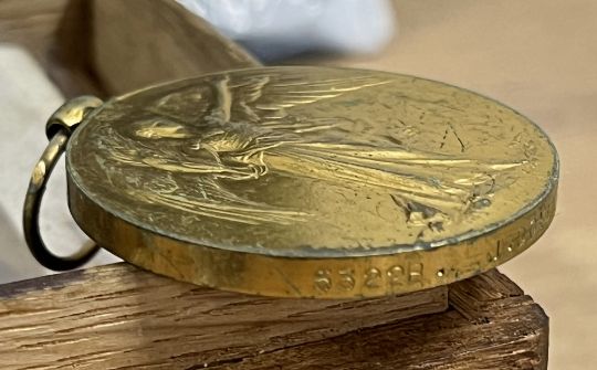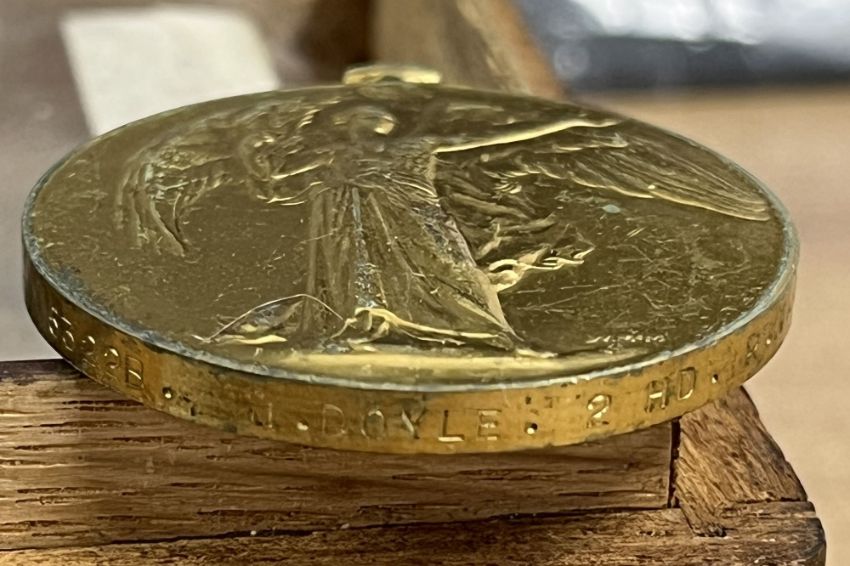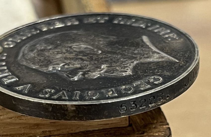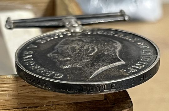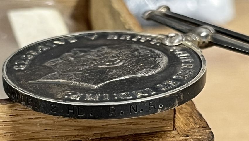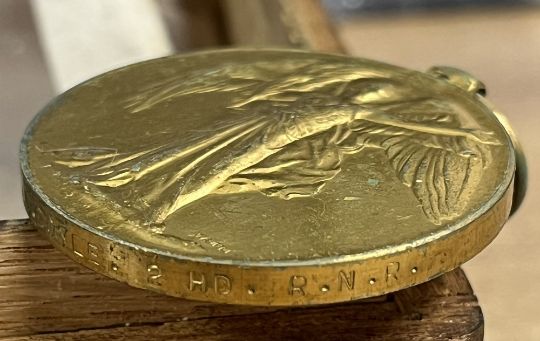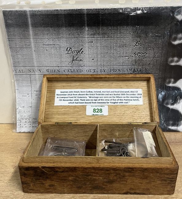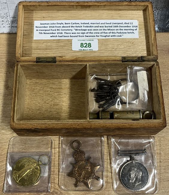 WW1 Royal Navy Reserve trio to Seaman John Doyle, who was reported as died on 12 November 1918, the day following the Armistice, from aboard the Padstow Ketch Trebiskin and who's body was washed ashore at Swansea almost one month later. Comprising 1914-15 star correctly impressed naming to B.5322. J. DOYLE. SMN. R.N.V.R. British War and Victory medals correctly impressed naming to 5322B. J. DOYLE. 2 HD. R.N.V.R. no ribbons, contained in a seaman's trinket box 6cm x 9cm x 19cm with a set of eight keys on a metal ring and a brass whistle engraved J.Hudson & Co of Birmingham Patent 1901 with War Department crowsfoot.(6) JOHN DOYLE, born Carlow, Ireland, lived Liverpool, served on HMS BULWARK in 1914 prior to her sinking and was aboard the RMS HESPERIAN when she was sunk on 8 September 1915 by Submarine U-20, Captained by Walther Schweiger - who had already sunk the RMS LUSITANIA in May - with 76 lives lost. This unlawful act was key to the decision of the United States of America to enter WW1 against Germany. He was aboard HMS MARKSMAN, part of the 12th Destroyer Flotilla operating in support of the Grand Fleet at the Battle of Jutland on 31 May-1 June 1916 and aboard HMS KING ALFRED when the ship was torpedoed by UB-86 on 11 April 1918, north of Ireland and subsequently beached. Later in 1918 he was aboard the TREBISKIN, a Padstow Ketch, when her wreckage was spotted on 7 November 1918. She had a crew of five and had been bound from Swansea to Youghal, Ireland carrying coal when presumably sunk with all hands. John Doyle's body was washed ashore at Swansea on 6 December, along with another crew member originally from Newfoundland and he was buried, aged 33yrs, on 16 December 1918 at Liverpool (Ford) Cemetery, Remembered with Honour by his parents and widow with a CWGC headstone. He lived an eventful life. Sold together with copy service papers from the National Archives and other online research copies.