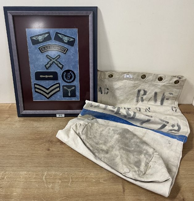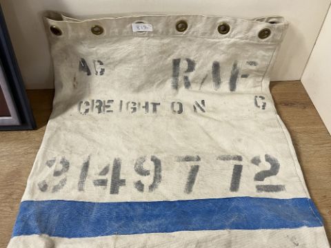 R.A.F. Regiment title, rank and trade badges professionally mounted, glazed and framed by Royal Air Force Eindhoven Association for the October 2001 Reunion. Eight badges mounted on light blue backing, with maroon mount in grey frame, 36cm x 46cm. Sold together with a 42cm x 85cm white canvas kit-bag with blue stripe and annotated RAF AC CREIGHTON C 3149772.(2)