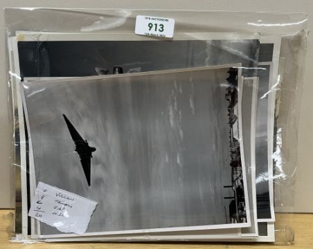 Avro 698 Vulcan VX770 related black and white photographs 4no. 16cm x 21cm annotated in pencil on reverse. A prototype bomber, which had been on a test flight to test its newly fitted RR Conway engines on the day of the accident, flying from the Rolls-Royce airfield at Hucknall when it crashed on 20 September 1958 at RAF Syerston, Nottinghamshire, to where it had diverted to participate in the Battle of Britain Day air show. The Vulcan flew along the runway, then started a rolling climb to starboard. During this manoeuvre the starboard wing disintegrated, resulting in a collapse of the main spar and wing structure. The Vulcan went into a dive with the starboard wing on fire and struck the ground. All four of the Vulcan crew were killed, along with three occupants of a controllers' caravan killed by debris and three servicemen who were in an ambulance were injured by debris. The official primary cause for the accident was a gross structural failure of the aircraft's main spar, which was confirmed by amateur footage, photographs and eyewitness accounts. The reason for the failure was not determined by the Board of Inquiry (BoI), but it was suggested by an accident investigator called in by Rolls-Royce that the main cause was that the pilot, upon performing the planned aerobatic display, exceeded the prototype's briefed speed and turning rate limits. The accident investigator submitted a statement to the BoI, but did not give evidence under oath. The BoI was apparently not informed that the aircraft manufacturer considered the basis for the statement to be invalid. The Technical Officer of the Board of Inquiry identified a suspected fatigue failure of the inboard arm of the front bottom wing attachment main forging and suggested vibration from the high airflow volumes required by the RR Conway engines as a possible cause. The Royal Aircraft Establishment carried out a structural analysis of the wreckage and produced a report on 21 April 1960, but no copy has been found in the public record. A poignant set of photographs.(4) Sold together with Royal Air Force related British Aerospace Aircraft Group 20cm x 25cm coloured photographs of a Tornado prototype AO3 ADV fully armed aircraft in RAF camouflage, a Tornado ADV from OCU 229 Squadron RAF Coningsby fully armed, a Tornado ADV F.2. and another flown by Flight Lieutenant Paxton RAF, another of the German Luftwaffe and another of the Italian Air Force, another of three Tornados in joint flight and a snap of the Tornado final assembly line at Messerschmitt-Bolow-Blohm.(8) Also, a British Aerospace Aircraft Group 20cm x 25cm coloured photograph of the BAE Experimental Aircraft Programme EAP demonstrator first flight on 8 August 1986 piloted by Dave Eagles, Executive Director Flight Operations and three later photographs of the EAP demonstrator on handling trials over the Lake District on 6 July 1987(4), a coloured photograph of a Harrier jump-jet on take off, and miscellaneous black and white photographs comprising a Panavia AIT BAC MBB fighter, an Air Ministry photo of two Sabres landing, and a British Aerospace English Electric Lightning XR754, built in 1965 and withdrawn from service in 1988. (20) An interesting and collectable lot with further research potential.