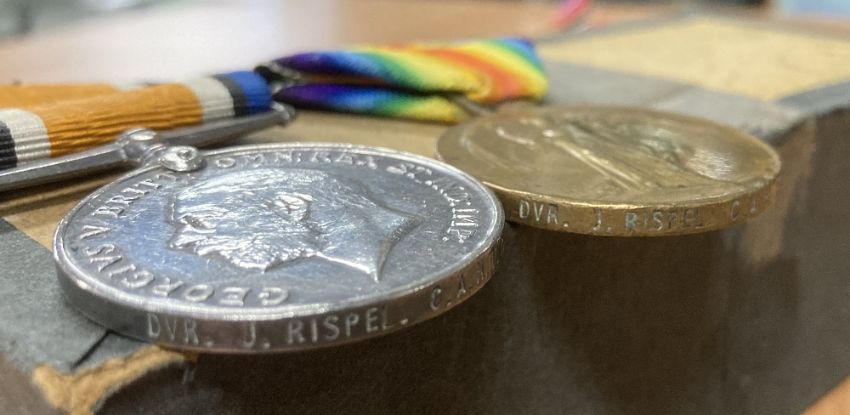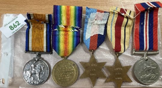 WW1 and WW2 South African group of five, comprising British War and Victory medals correctly impressed naming to DVR. J. RISPEL. C.A.H.T.C. Cape Auxiliary Horse Transport Corps and 1939-45, Africa stars, War medal engraved naming to C.167375 J.J.B. RISPEL possibly a father and son connection.(5)
