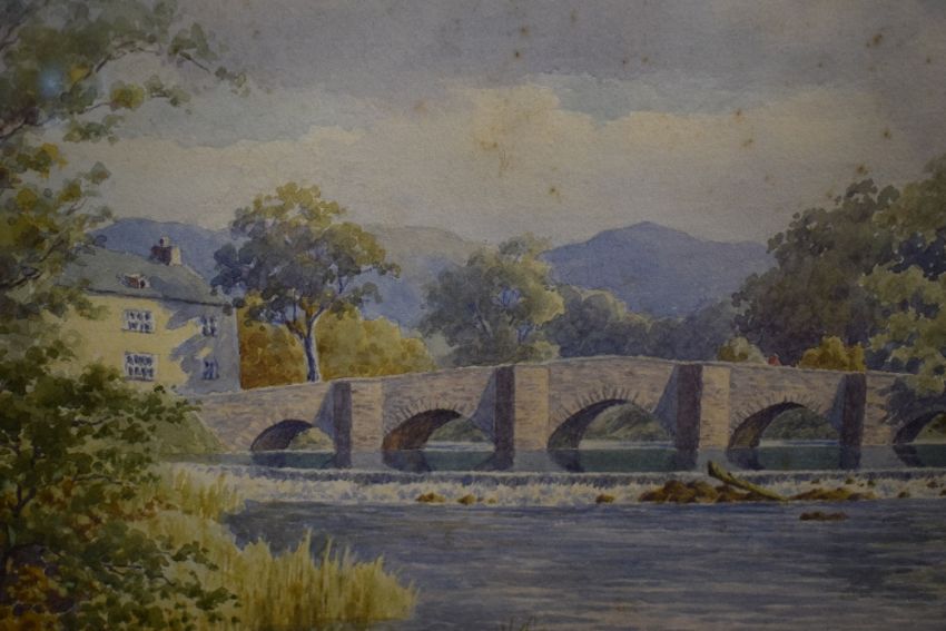 *Local Interest* Albert Rosser (British 1899 - 1995) Watercolour 'Newby Bridge and the River Leven' a late summer study of the village on the edge of Windermere, signed lower left, counter signed to lower right margin and entitled to left, attributed and entitled verso, within washline card mount and moulded frame, under glass 35.5cm x 25cm & 55cm x 44.5cm overall. Foxing to painting and mount, crack to glass lower right.