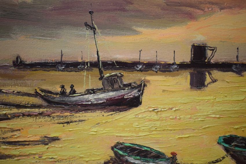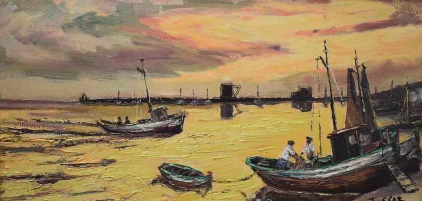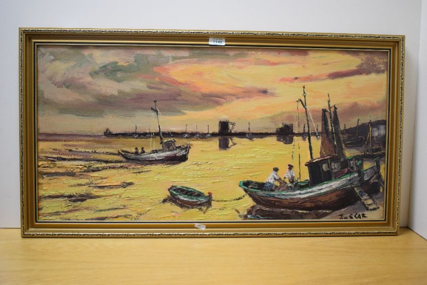 Joscar E Catello (Spanish 20th Century) Oil on canvas 'San Carlos Rapita', depicting fishing boats coming into port at sunset, signed lower right, attributed entitled and dated (8/10/70) verso, within moulded gilt frame 79cm x 38.5cm & 86.5cm x 46cm overall.