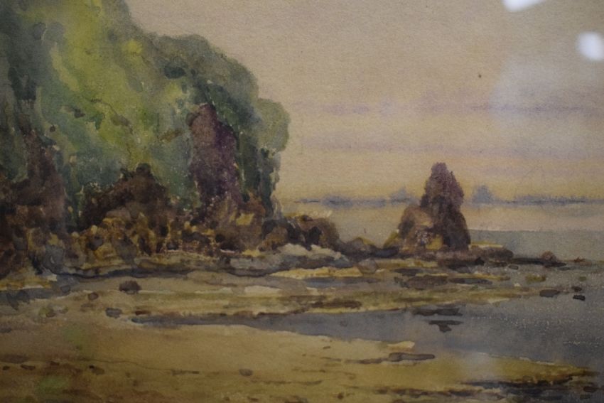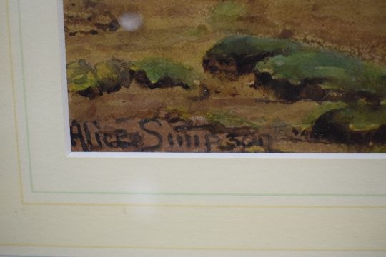 Alice Simpson (British 20th Century) Watercolour, a costal landscape with sailing boats, within washline card mount and moulded gilt frame, under glass 32cm x 18.5cm overall.