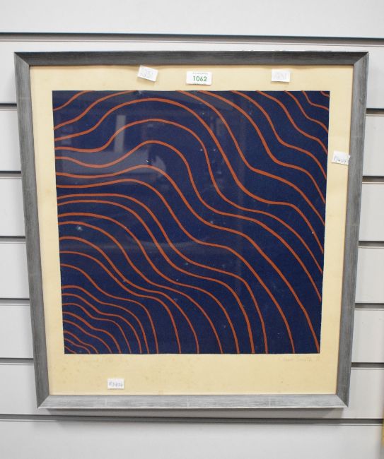 Claire Smith (20th Century) Screen print 'Ploughed Field', waved orange lines on a navy background, signed and dated (1970) in pencil to lower margin, entitled and numbered (1/12) to lower left, within moulded frame, under glass 39.5cm x 40cm & 50cm 55cm overall.