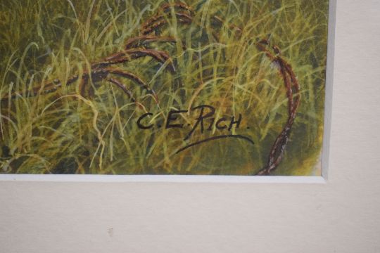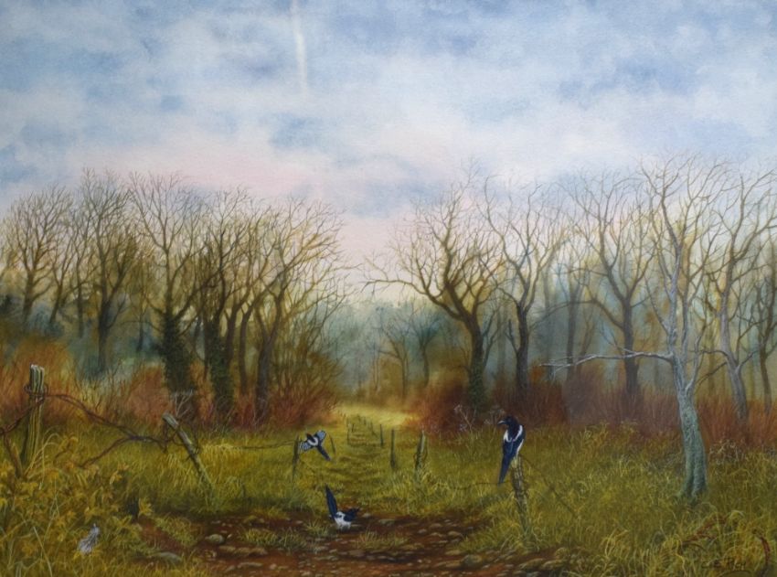 *Local Interest* C.E Rich (British Contemporary) Watercolour '3 Magpies', a detailed study of the birds in a Winter woodland, signed lower right, entitled and attributed verso, within card mount and moulded frame, under glass 42cm x 31.5cm & 57cm x 48cm overall.