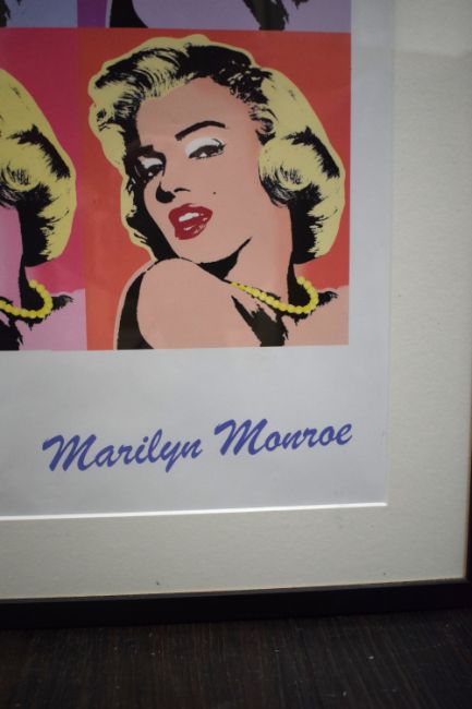 In the manner of Andy Warhol (American 1928 - 1957) Lithograph 'Marilyn Monroe', the actress/model's portrait repeated in pop art style, entitled to lower right margin, within card mount and thin black frame, under glass 57cm x 87cm & 69cm x 99cm overall.