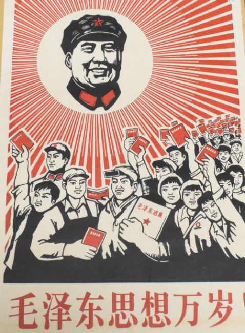 A Chinese Cultural Revolution wood-cut Communist propaganda poster, featuring an image of Chairman Mao's face as the sun shining down on enthusiastic crowds holding Mao's Little red Book, with text below roughly translating as 'Following Chairman Mao closely we advance through storms and waves' unframed, 77cm x 53.5cm overall.