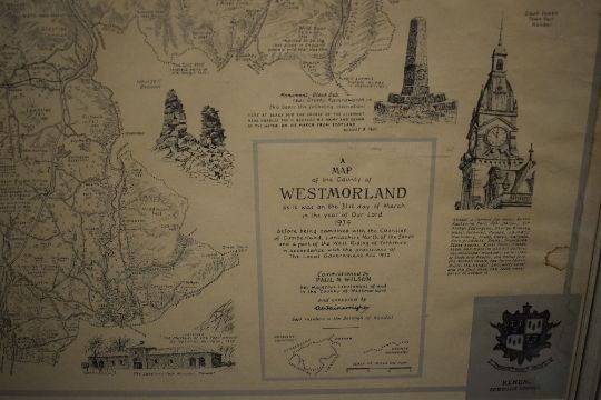 *Local Interest* After Alfred Wainwright (British 1907 - 1991) 'A Map of the County of Westmorland' a detailed study of the Historic county in Wainwright's signature style 'as it was on the 31st day of March in the year of our lord 1974 before being combined with the Counties of Cumberland, Lancashire North of the Sands and part of the West Riding of Yorkshire in accordance with the provisions of The Local Government Act 1972', within moulded frame, under glass 61cm x 52.5cm & 64cm x 56cm overall. Some water damage to left and right corners.