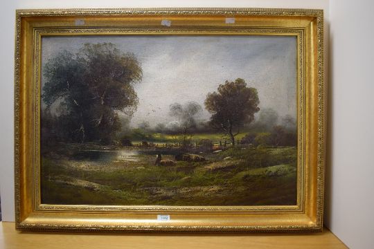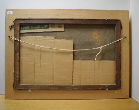 19th/20th Century oil on canvas, a country fishing scene, unsigned or attributed, within moulded gilt frame, 75cm x 49cm & 90.5cm x 65cm overall. Dirt to surface of painting.