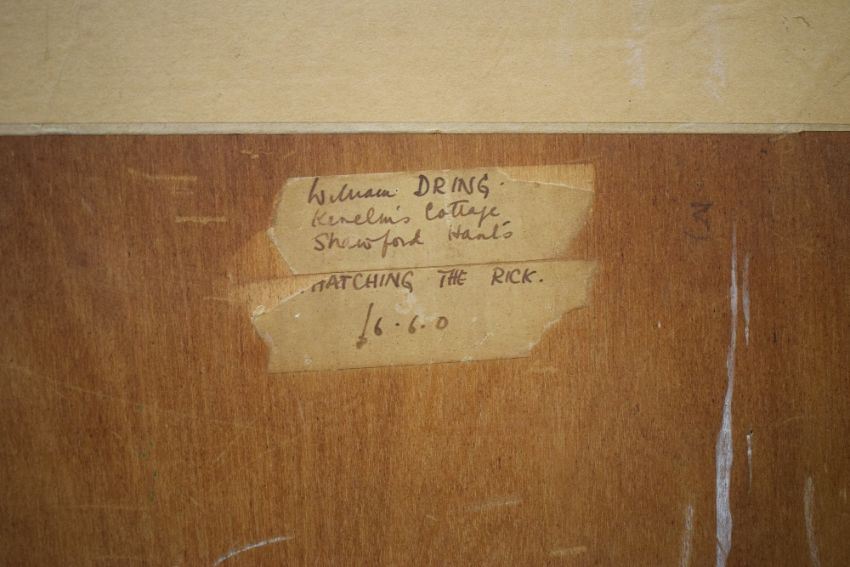 William Dring (British 1904 - 1990) Watercolour 'Thatching the Rick', depicting a thatcher working on the roof of a small dwelling, attributed and entitled verso, within stepped card mount and moulded gilt frame, under glass 24cm x 34cm & 34.5cm x 52cm overall.