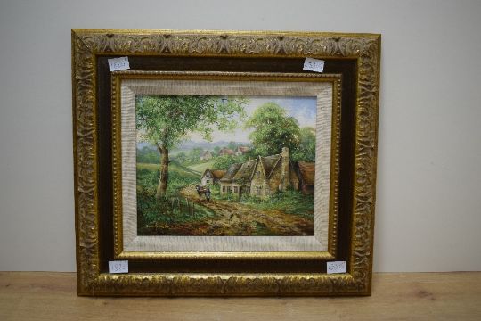Christopher Howells (British 1947 - 2013) A pair of oils on canvas, depicting a man leading a horse and a rural hamlet of cottages, both signed lower left, within canvas slip and moulded gilt frame 24cm x 19cm & 41cm x 36cm overall
