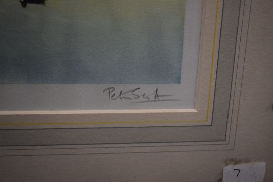 After Peter Scott (British 1909-1989) Lithograph 'Sunset from the Artists Window', pond scene with ducks and geese, signed in pencil to lower right margin, within washline card mount and moulded frame, under glass 56cm x 38cm & 76cm x 57.5cm overall.