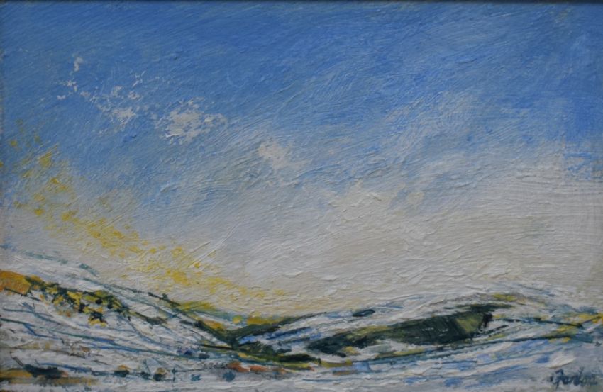 Frank Gordon (British B.1943) Oil on board 'Snowfall', capturing winter over the Yorkshire Dales, signed lower right, entitled and attributed verso, within flat white frame, 17.5cm x 11.5cm & 31.5cm x 26cm overall.