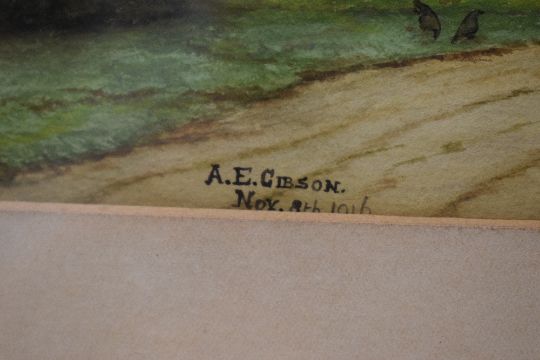 A.E.Gibson (Early 20th Century) Watercolour, a farm house with a woman feeding chickens, signed and dated (November 8th 1916) lower centre, within card mount and moulded gilt frame, under glass 20cm x 13.5cm & 39.5cm x 33cm overall.