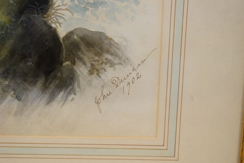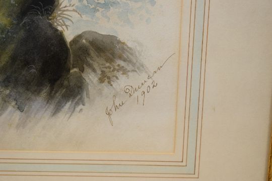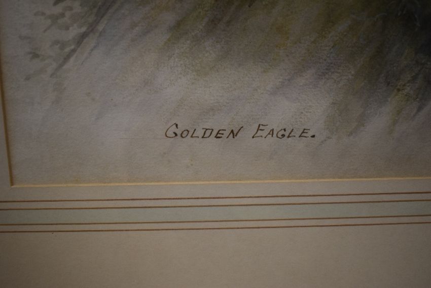 John Duncan (19th/20th Century) Watercolour 'Golden Eagle', depicting the bird of prey perched on rocks, signed and dated (1902) lower right and entitled lower left, within washline card mount and moulded frame, under glass 29cm x 35cm & 48.5cm x 57cm overall.