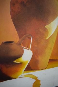 Angels Madrueno (UAE 20th Century) Oil on canvas 'Mollos', a still life study of a terracotta plant pot and watering can in sunlight, signed and dated (2000) lower left, attributed and entitled verso, within moulded frame, 49cm x 59cm & 63cm x 73cm overall.