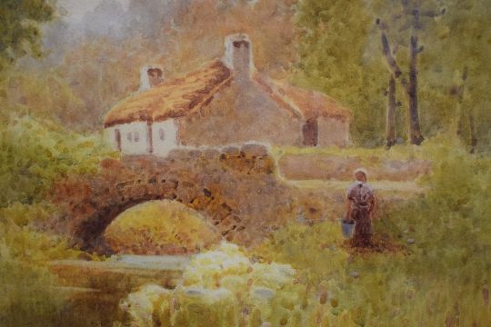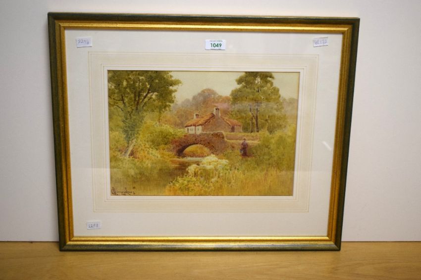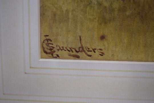 Charles L Saunders (British 1855-1915) Watercolour, an Impressionistic watercolour with a riverside cottage and figure, signed lower left, within washline card mount and moulded gilt frame, under glass 34cm x 23cm & 53.5cm x 44.5cm overall. Some discolouration.