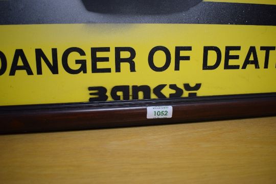 In the style of Banksy (British Contemporary) Mixed media 'Danger of Death' street sign, facsimile signature lower centre, within moulded wooden frame 49.5cm x 52cm & 57.5cm x 59.5cm overall. *We cannot confirm in anyway if this artwork is associated with the artist Banksy, from the information we have gathered we believe these to be reproductions inspired by the artist.