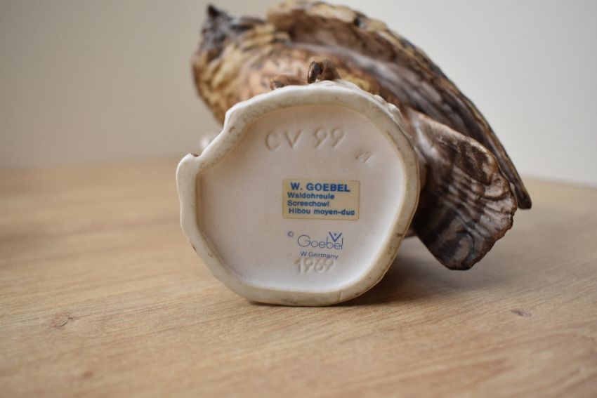 A Beswick Pottery Beatrix Potter animal group 'Old Mr Brown' sold together with a Goebel porcelain Screechowl study model number CV 99 and three similar owl studies, largest measures 22cm tall.