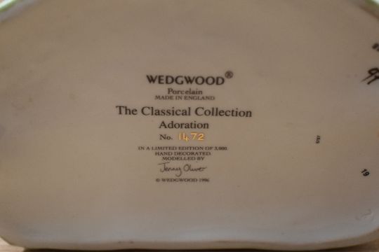 A large limited edition Wedgwood English porcelain 'The Classical Collection' series figure group 'Adoration' limited edition number 1472/3000, designed by Jenny Oliver, measures 31cm tall, complete with box.