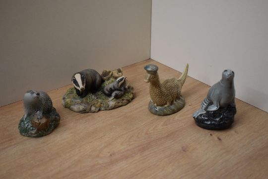 A group of three Beswick Pottery, for Beneagles Scotch Whisky, miniature decanters comprising Loch Ness Monster designed by Albert Hallam, Badger designed by D Lyttelton and Seal designed by Graham Tongue sold alongside a Border Fine Arts animal group 'Badger' model number RW3 Richard Wawrzesta.