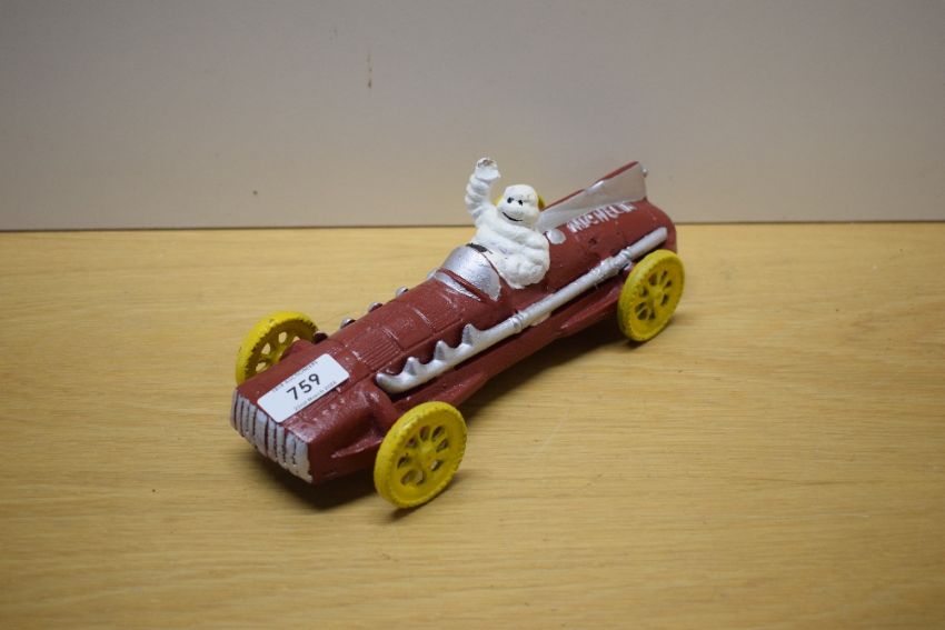 A painted cast model of Michelin Man in vintage racing car