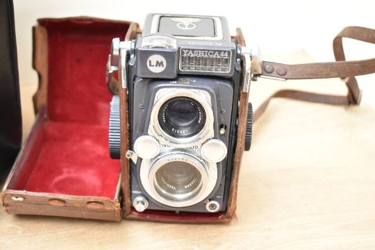 A Yashicka 44 reflex camera with Yashinon 1:3,5 60mm lenses in leather cover