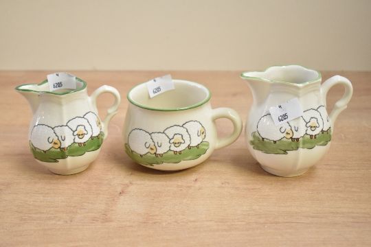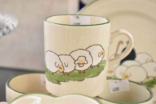 A selection of vintage German Zeller Keramik sheep teaware, to feature sweet hand painted shepherd and sheep decoration, to include a teapot, cups, saucer, milk jugs, plates, sugar bowl and bowls, all marked to base, (approximately 20 pieces), condition is consistent with age and use, having visible areas of surface wear, no large visible chips, cracks or fixed damage, sold as seen.