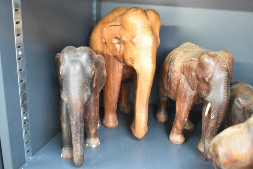 A selection of 20th-century African Art hand carved hardwood elephant sculptures, featuring a variety of sizes and compositions, all unmarked, (approximately 12), condition is consistent with age and use, some visible areas of wear in the form of chips, scratches or tusk/nail damage.