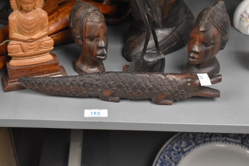 A large quantity of 20th-century African and Indian Art, mainly hand carved hard wood pieces, to include hard wood African female busts; a crocodile; two decorative interlocking bowl stands and more, mostly unmarked, (10), condition is consistent with age and use, all sold as seen, stork/crane figure has a broken beak.