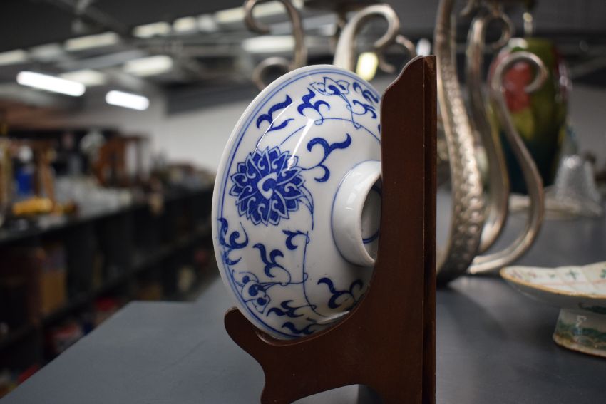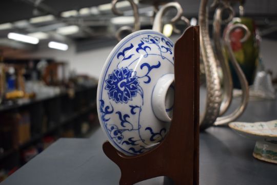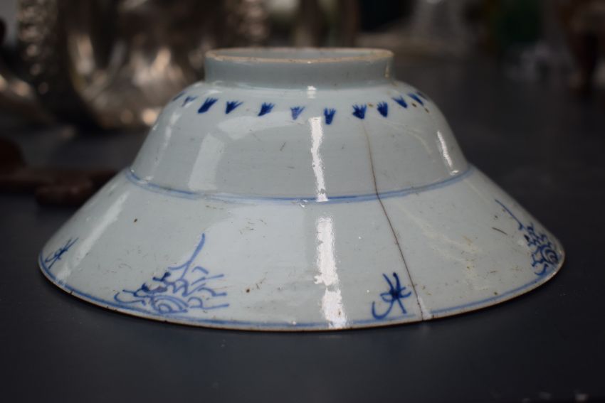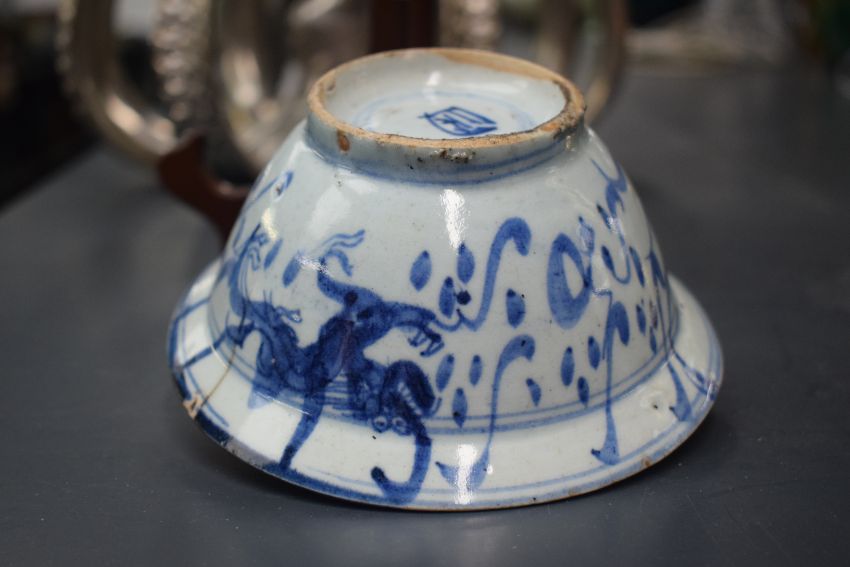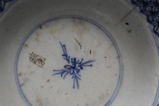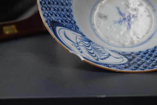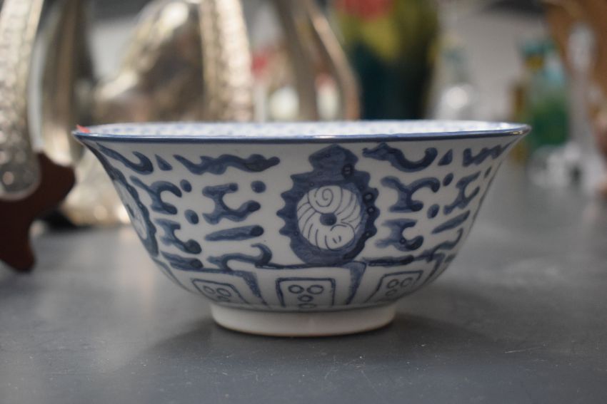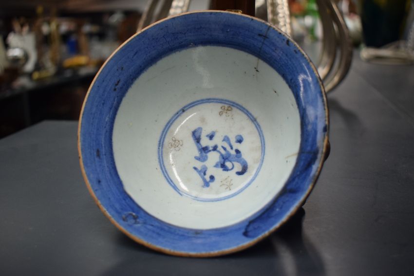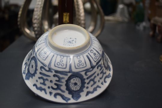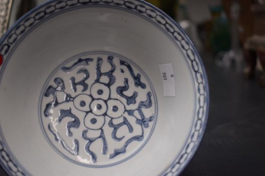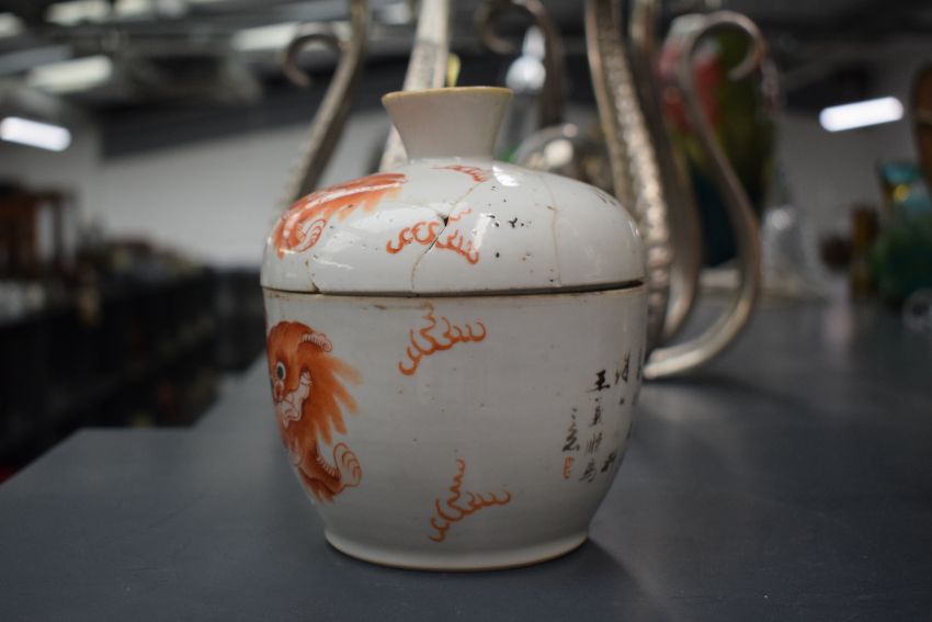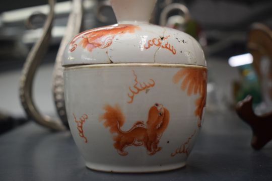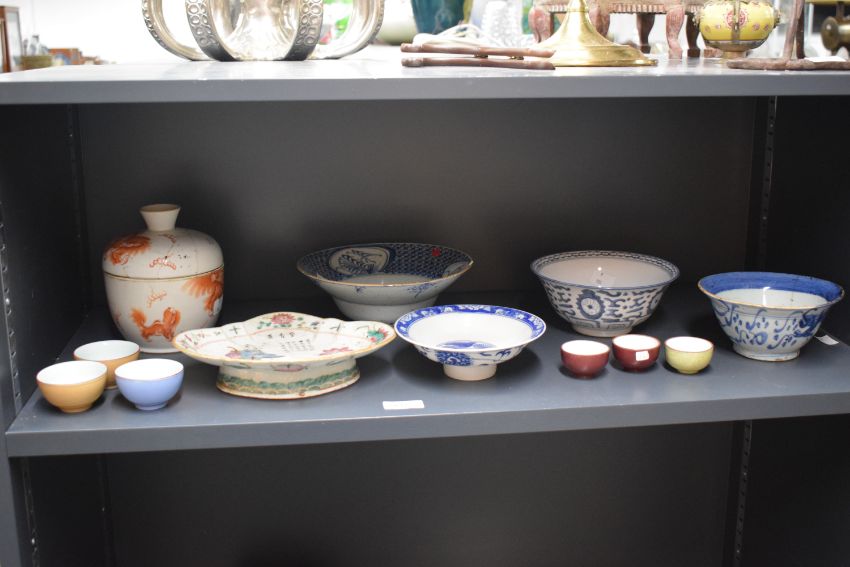 A quantity of 19th to 20th-century Chinese porcelain ware, to include a Famille Rose footed dish with a petal-from rim, turquoise toned wave decoration and a central depiction of a seated traditionally dressed man with han script; a blue and white 'kalpmuts'-style bowl, presumed Qing Dynasty, featuring a delicate floral and foliate motifs with repeating geometric border pattern to rim; a red lion 'Hong Shi' ginger jar; a selection of colourful Yixing clay teacups and more, most marked, (12 pieces), condition is consistent with age and use, some pieces have visible significant repaired damage, with some small cracks and chips, as well as surface wear, all sold as seen.