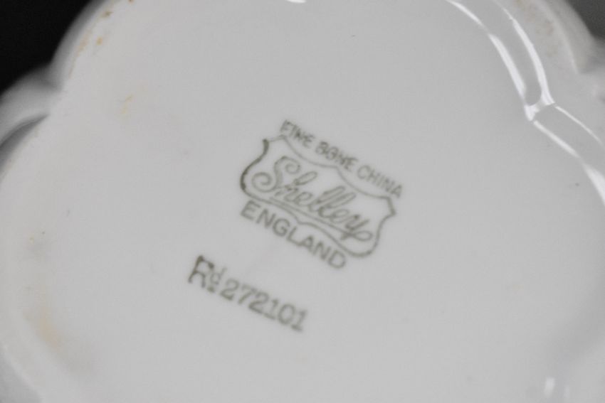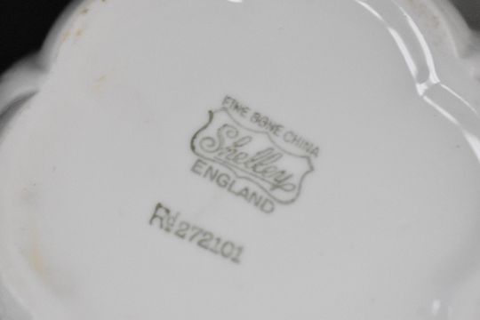 A 20th-century Shelley fine bone china part dinner service, to feature delicate petal-formed motifs and scalloped rims, to include plates, bowls, cups, saucers, milk creamer, sugar bowl and more, all marked to base, (approximately 36 pieces), condition is consistent with age and use, having some visible areas of use, sold as seen.