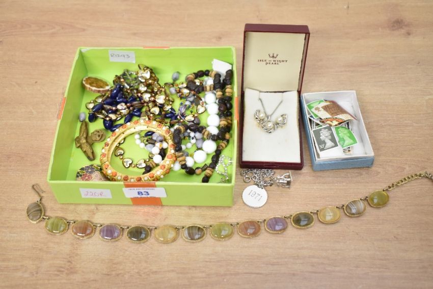 A small assortment of costume jewellery, including beaded jewellery, brooches and a bangle