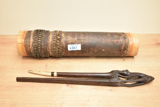 Thought to be 20th-century Chinese hand-carved dark wood hair stick, featuring a slender, zoomorphic creature atop two formed 'pins'; sold with a Chinese bamboo handheld instrument, featuring intricate woven detailing and an interior rattle, both unmarked, 35cm pin and 34cm instrument, condition is consistent with age and use, small chipped area to end of one of pins, visible surface use to instrument with some of the weaving coming loose.