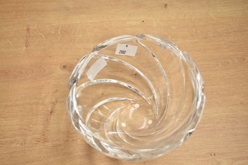 A 20th-century Orrefors crystal bowl by Jan Johansson, featuring a distinctive v-cut rim and swirling design, acid etched signature to base, 16cm diameter, condition is consistent with age and use, no visible cracks or chips but sticker residue marks.