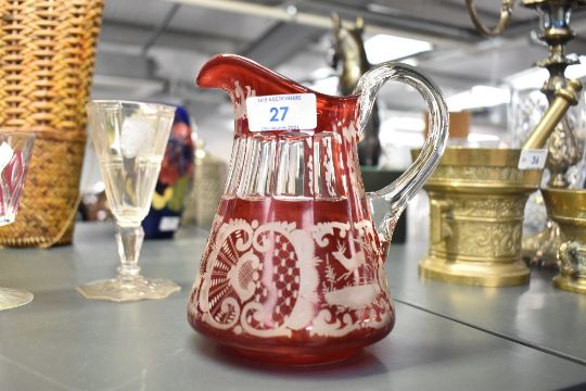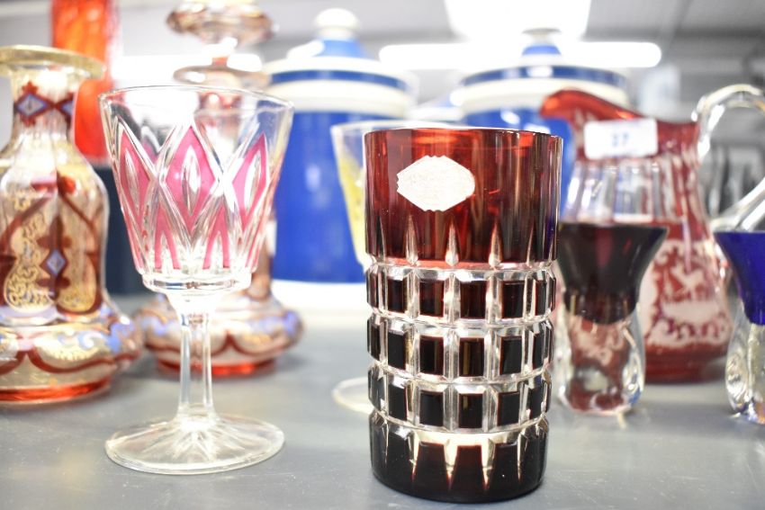 A selection of late 19th to early 20th-century coloured glassware, to feature two Bohemian-style ruby cut glass perfume bottles; a set of three Scandinavian-style colourful art glass tumblers; a Bohemian-style ruby red glass pitcher, featuring wheel-cut designs of foliage, foliate and stag detailing and more, most unmarked, (14 pieces), condition is consistent with age and use, a couple of small visible cracks to rims or base.