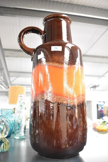 A large mid 20th-century West German Scheurich-style floor vase, featuring a 'fabiola' glaze of molasses-brown and a fiery crimson central band, marked to base, 53cm, condition is consistent with age and use, no visible chips, cracks or fixed damage.